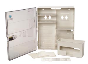 ICU Isolation Station, Glass Mountable, Contains: Glass Mount Bracket with Adhesive Strips, (4) Adjustable Shelves, (2) Door Pockets, (2) Storage Bins, Ambu Bag Shelf, Glove Dispenser (#8562), 20½” x 6¾” x 17¾”, 1/cs