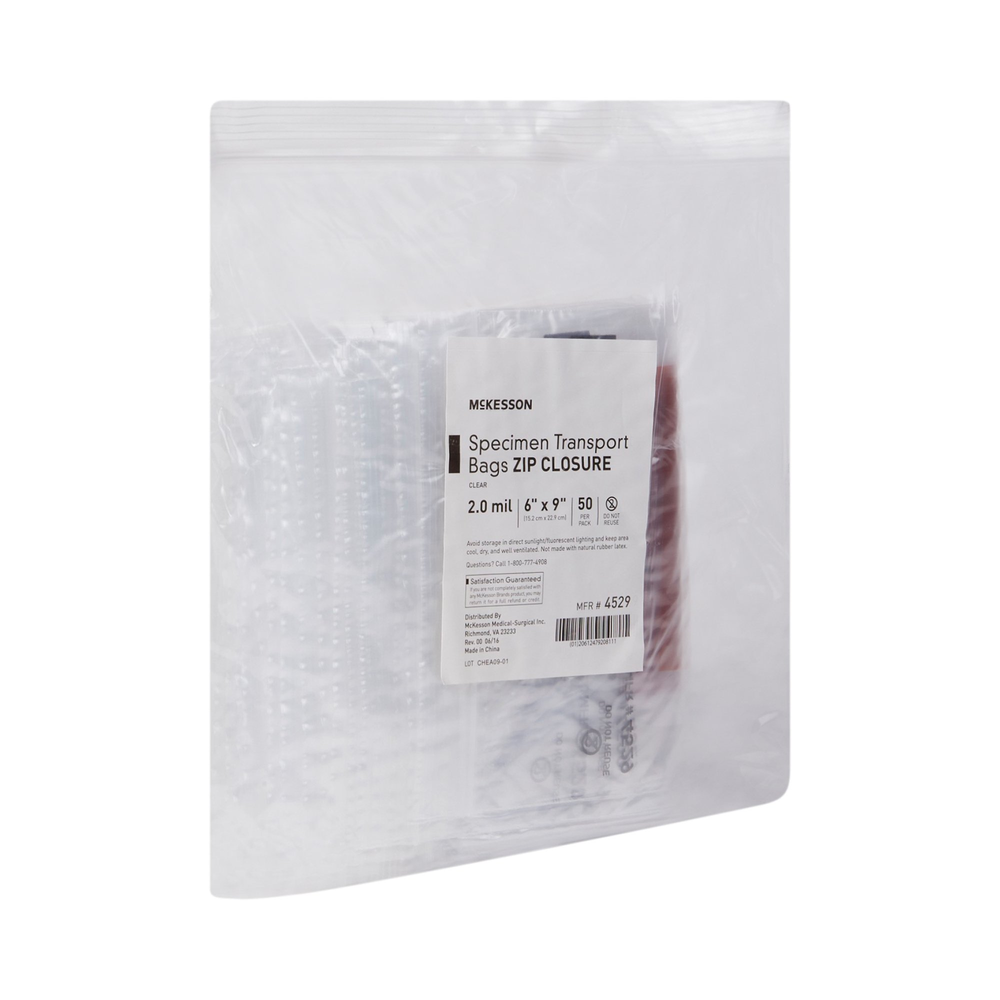 McKesson Brand Specimen Transport Bags (Product #4529) are essential for the safe and secure handling of laboratory samples. These transparent polyethylene bags feature a prominent orange and black biohazard symbol to ensure compliance with OSHA and clinical safety standards. Equipped with a reliable zip-top closure, they provide a leak-proof seal to protect healthcare workers from exposure during the transport of blood, urine, or tissue samples.